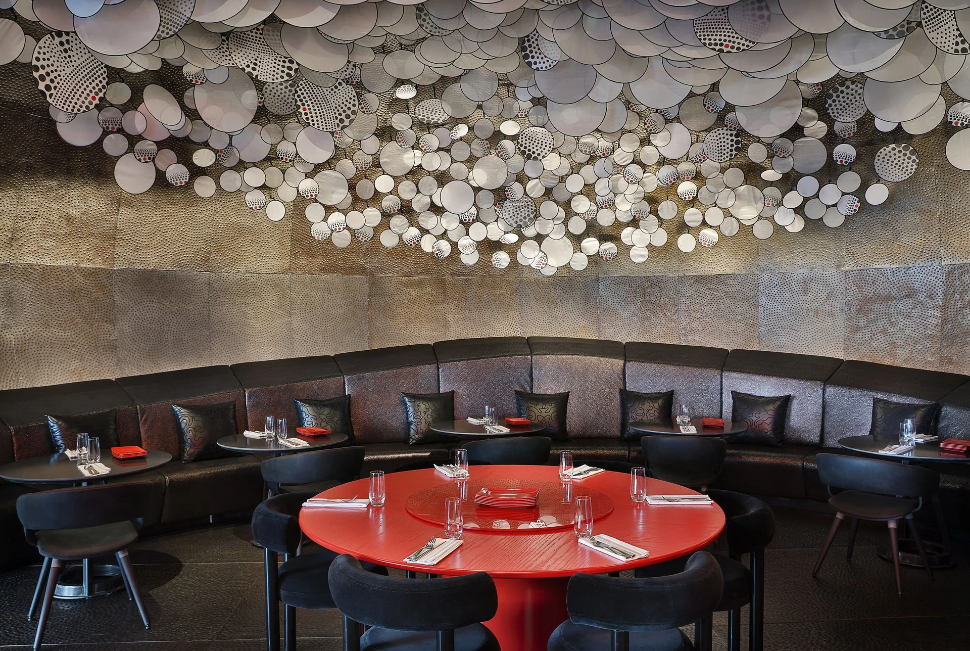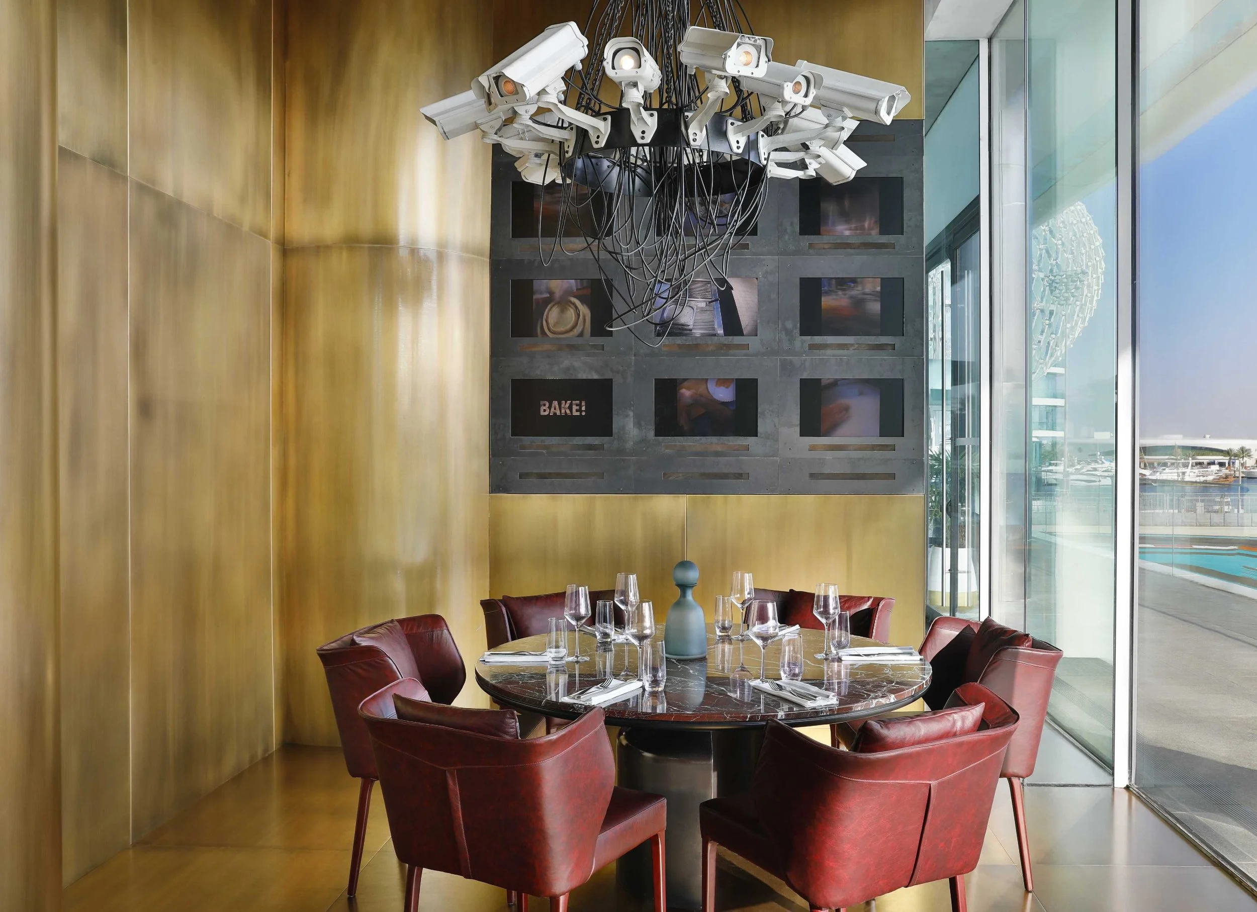 The steakhouse Meat Vault features burgundy leather chairs and center dining table in rosso levanto, courtesy of steak marbling.